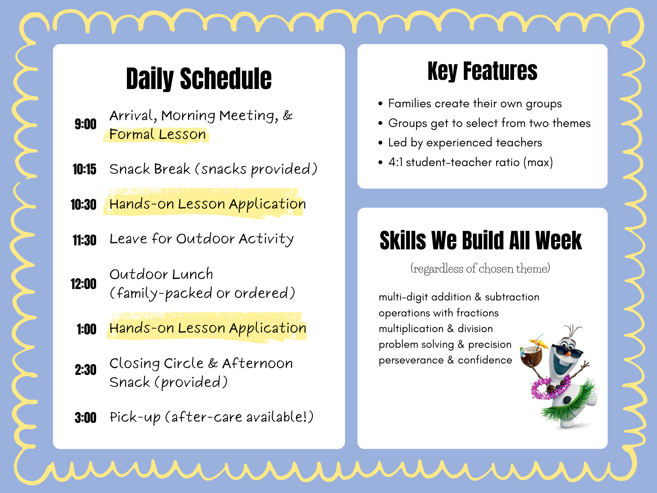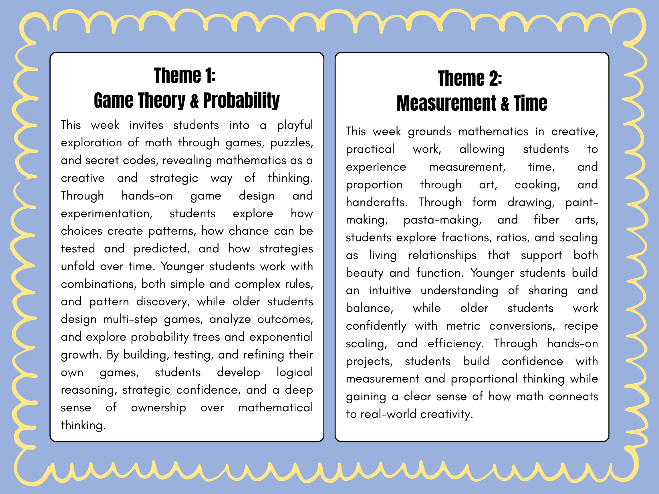 Families get to create their own groups of four students, ensuring a social environment that feels comfortable, supportive, and well-matched. Each group then chooses from two immersive weekly themes. Both themes strengthen the same core skills — multi-digit addition and subtraction, operations with fractions, multiplication and division, problem solving, precision, and perseverance — through projects that feel exciting and relevant.